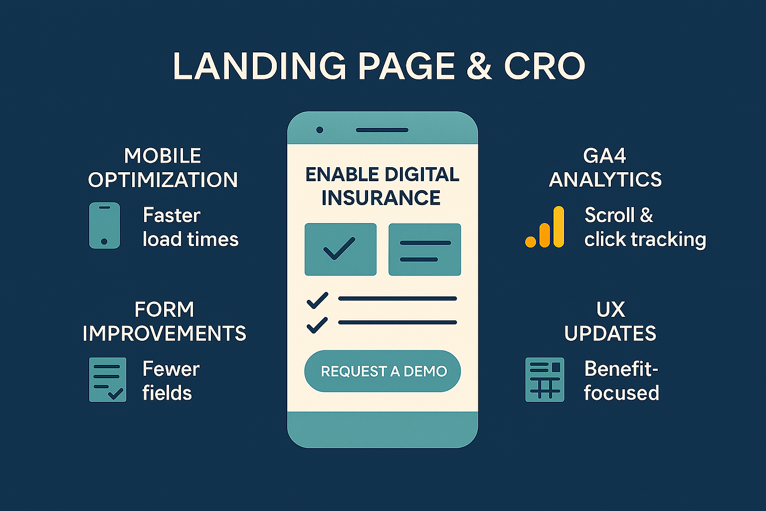 Riskcovry required an integrated performance program to elevate lead volume and conversion quality in a competitive FinTech/Insurtech landscape. The project scope spanned: